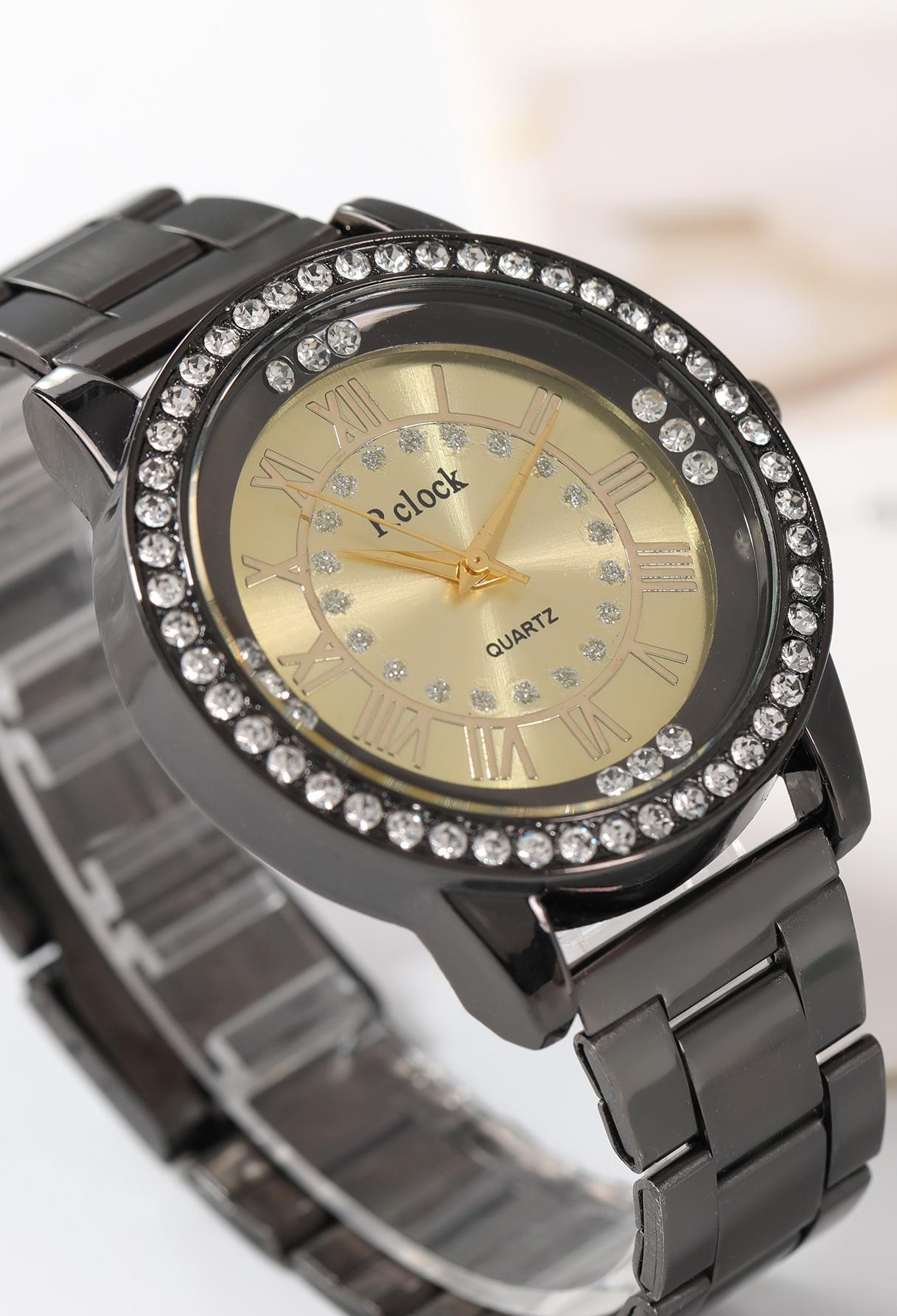 ساعت کوارتز زنانه نگین دار مشکی صفحه طلایی