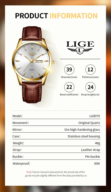 ساعت مچی مردانه LIGE مد برند برتر ساعت مچی کوارتز مردانه بند چرمی ضد آب ساعت مچی مردانه گاه به گاه تجاری